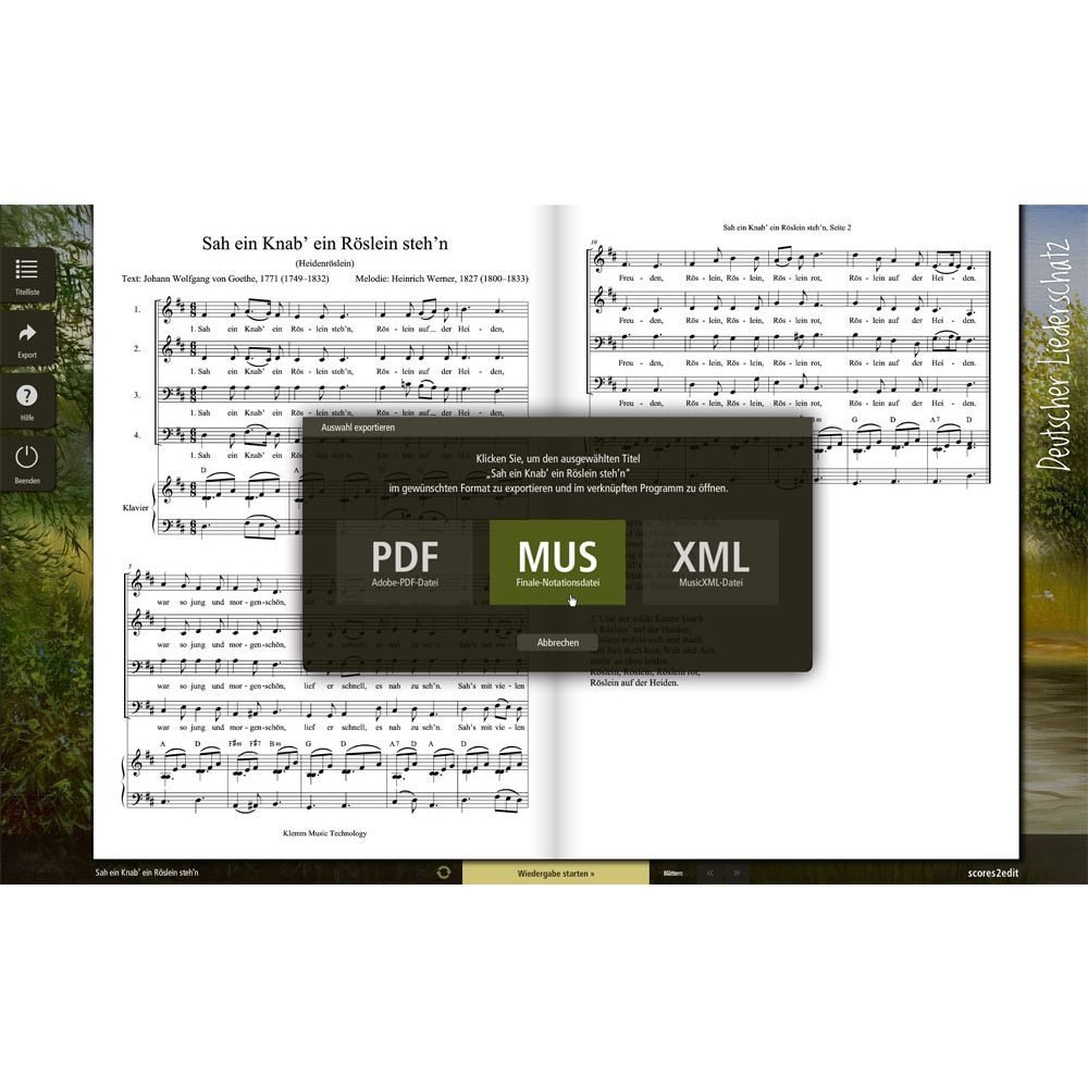 Die digitale Liedersammlung scores2edit Deutscher Liederschatz 2.0 enthält 250 der bekanntesten deutschen Volkslieder. Jedes Lied kann in 30 verschiedenen Arrangements für verschiedene Besetzungen aufgerufen werden. Damit stehen Ihnen im Deutschen Liederschatz sage und schreibe 7.500 professionell gesetzte Notenausgaben zur Verfügung. Eine übersichtliche Benutzeroberfläche macht es Ihnen leicht, mit dem umfangreichen Material umzugehen: Surfen Sie in verschiedenen Titellisten, um sich ein Lied auszusuchen. Legen Sie die Anzahl der Stimmen und andere grundlegende Parameter der Partitur fest. Rufen Sie das ausgewählte Stück bildschirmfüllend auf, starten Sie die Wiedergabe und lesen, singen oder spielen Sie mit. Doch nicht genug: Mit nur einem Mausklick öffnen Sie das ausgewählte Lied-Arrangement in dem Finale-Notationsprogramm, das auf Ihrem Computer installiert ist. Dort können Sie das S